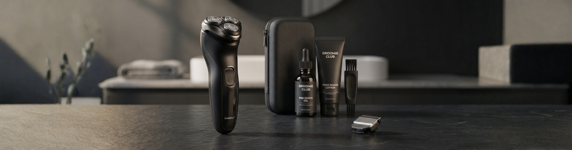 Groomie Club focuses on electric head & face shaving with the BaldiePro™ system—plus blade refills, bundles, and skin-care add-ons built for a clean, repeatable routine.